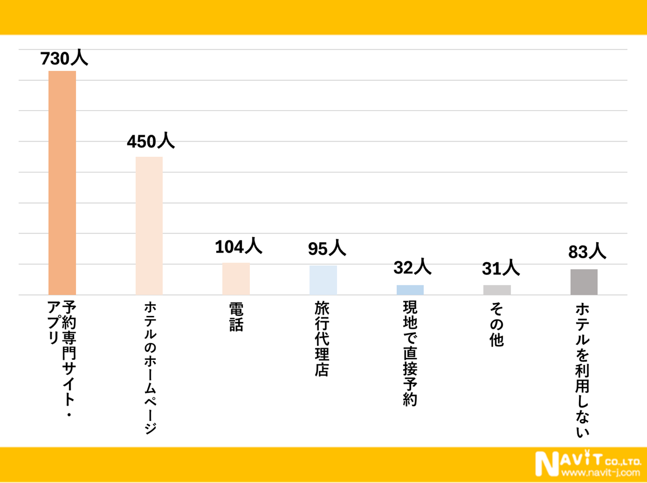 ホテルの予約方法についてのアンケートも、複数回答でいただきました。一番回答数が多かったのは「予約専門サイト・アプリ」で、730人でした。次に多いのが「ホテルのホームページ」で450人、そして「電話」が104人と続きます。便利に予約できる媒体に圧倒的な支持が集まっています。