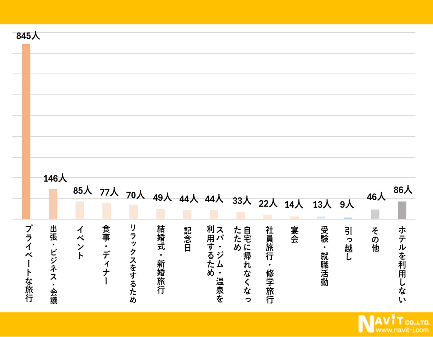 ホテルを利用する目的についてのアンケートを、複数回答にていただきました。最も多かったのは「プライベートな旅行」で、845人と圧倒的な回答数でした。以降は「出張・ビジネス・会議」の146人、「イベント」の85人と続いています。ほかの場所での活動のついでに利用するケースが多い一方で、ホテルそのものを利用することを目的とするケースは少ない傾向にあるようです。