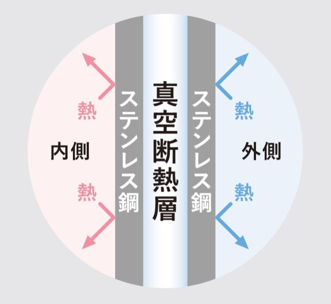 ▼真空断熱層が内外を区切り、飲みものの温度を逃さない