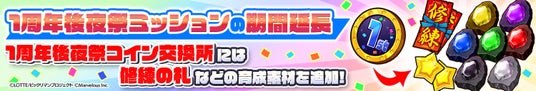 開催中の「後夜祭デイリーミッション」と「1周年後夜祭コイン交換所」につきまして、開催期間を延長いたしました。