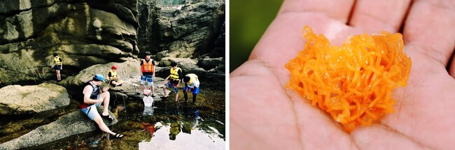 2021年より、かもめ島マリンピングでは「かもめ島生物データベース化計画」の名のもと、島内で観察された動植物をデータベース化・MAP化しており、これまで100種以上をホームページ上で公開しています。ですが、過去のイベントは主に未就学児や小学生が参加対象であったため、立入りに一定のリスクが伴う外洋側岩礁部に空白地帯が存在していました。ライフジャケットとマリンシューズ・救命用具携行で完全装備した中学生たちが今回、この空白地帯を果敢に調査。浅瀬を乗り越え、岸壁を乗り越えて、釣りやガサガサで生物データ収集に励んでくれました。結果として、海藻や海浜植物、海洋生物合わせ20種以上の撮影データが集まり、種の同定後の公開に向け準備を進めています。