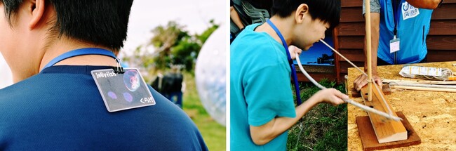 当イベントでは地域のALT講師にも参加いただき、英会話要素をプラス。初対面の参加者がスムーズにキャンプ入りでき、緊張なく英語を使えるよう、オープニングには様々な工夫を凝らしました。自分の背中に貼られた「海の生き物カード」を英会話による質問から導き出し当てるアイスブレイクゲームや、海洋漂着物を利用して作られた弓切り式火起し器などによる火起し挑戦では、徐々に緊張がほぐれ中学生らしい元気な姿を見せてくれるようになりました。