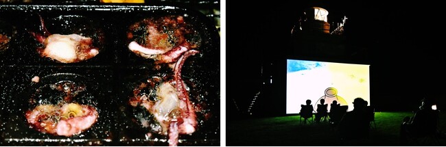続く海鮮BBQディナーでは、用意された地域の海産品をオリジナル調味で楽しみながら、新たな海の食文化づくりに挑戦。特に優れていたのは「イカのバター焼き」「ツブ貝とイカゲソのアヒージョ」。来年度以降のBBQ提供メニューに取り入れられそうな良い味でした。ディナー後は鴎島灯台壁面へのプロジェクションで「航路標識ミニ講座」、「海ノ民話のまちプロジェクト[折居婆さんと鰊]」上映なども実施。楽しいキャンプの夜、新鮮な手法で海の知識を習得してもらいました。