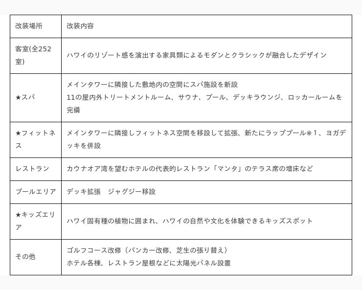 このたび、全客室252室の改装、屋内外11のトリートメントルームを備えるスパおよびラッププール※1完備のフィットネス施設の新設、ハワイの自然を体験するキッズエリアの新設を含む大規模な改装を段階的に行い、開業60周年を迎える2025年春頃にリニューアルオープンを予定しております。美しい景観を損なわず、60年代にロックフェラー氏が築いたその遺産と伝統を尊重しながら、自然の中でのアクティビティや健康に対する意識が高い幅広い世代に向けたウェルネス施設を拡充することで、長く未来に渡り愛されるホテルを目指してまいります。