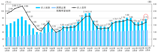 来春2024年3月卒業予定の大学生・大学院生対象の大卒求人倍率は1.71倍と、2023年卒の1.58倍より0.13ポイント上昇した。2021年卒は新型コロナウイルスの感染拡大による景況感の悪化により、倍率は10年ぶりに0.3ポイント以上低下し1.53倍となった。2022年卒でもコロナ禍の影響でわずかに低下したものの、1.5倍台を維持。その後、2023年卒では1.58倍に上昇し、採用意欲が回復に向かう結果となった。今年(来春2024年卒)は0.13ポイントの上昇となり、より採用意欲が高まっている。