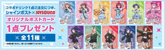 コラボドリンクのラインナップは、「シャインポスト」のユニットをイメージしたオリジナルコラボドリンク3種を、各750円(税込)で販売します。コラボドリンク1杯ご購入につき、オリジナルポストカード全11種からランダムで1枚プレゼントします。