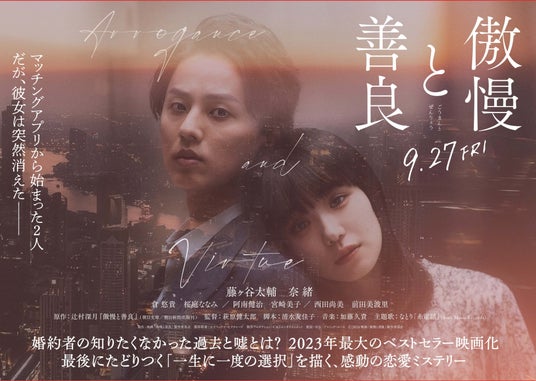 作家生活15周年記念作品として刊行され、累計発行部数100万部を突破した辻村深月さんの傑作恋愛ミステリ『傲慢と善良』(朝日文庫/2022年9月刊)。W主演に藤ヶ谷太輔さんと奈緒さんを迎え、映画「傲慢と善良」が2024年9月27日(金)より全国公開されます。このたび、映画公開を記念し、書店でもキャスト着用の衣裳展&場面写真を使用したパネル展の開催が決定しました。衣装展は8月末から書店6店舗にて実施。また、全国100店舗以上で映画の場面写真を使用したパネル展の開催も決定! 詳細は朝日新聞出版のHPでご確認ください。