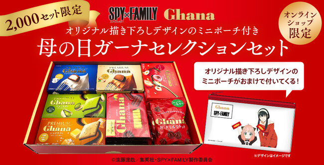 株式会社ロッテは4月3日(月)に、TVアニメ「SPY×FAMILY」オリジナル描き下ろしデザインのミニポーチ付きのチョコレート詰め合わせセット『母の日ガーナセレクションセット』をロッテグループ公式オンラインモールにて2,000セット限定で予約販売を開始いたします。