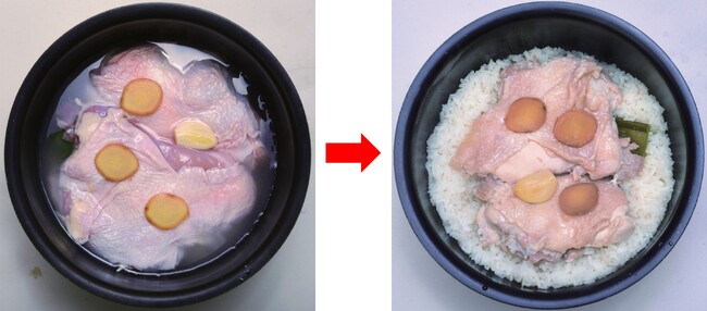 3.長ねぎの青い部分→皮目を上にした鶏もも肉→ しょうがのスライス、つぶしたにんにく(お好みで)の順にのせ、ふつうモードで炊く。