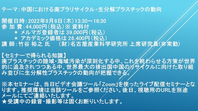 先端技術情報や市場情報を提供している(株)シーエムシー・リサーチ(千代田区神田錦町: https://cmcre.com/ )では、 各種材料・化学品などの市場動向・技術動向のセミナーや書籍発行を行っておりますが、 このたび「中国における廃プラリサイクル・生分解プラスチックの動向」と題するセミナーを、 講師に竹谷 裕之 氏 (財)名古屋産業科学研究所 上席研究員(非常勤))をお迎えし、2022年9月8日(木)13:30より、 ZOOMを利用したライブ配信で開催いたします。 受講料は、 一般:44,000円(税込)、 弊社メルマガ会員:39,600円(税込)、 アカデミック価格は26,400円(税込)となっております(資料付)。
