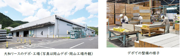 大和リースの「デポ」はレンタル用の建物部材を解体入荷後、基準に沿った品質チェックを行い、使用できるものは整備して繰り返し使用できるようにする建物リユースシステムの物流拠点です。「工場」は材料となる資材を調達し、加工・組立までを一貫した流れで生産するシステム建築の生産拠点です。全国でデポは14拠点、工場は6拠点を稼働しており、ISO9001(品質)・ISO14001(環境)認証を取得しています。