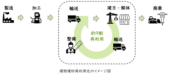 この取り組みでは、閉店したローソン店舗の躯体・外壁部分(基礎部分を除く)に使用している建材を重量ベースで約9割再利用します。また近年、国際的な課題となっているエンボディード・カーボン(※1)の削減も目的としており、新店舗を建設する際の資材製造から建物が完成するまでのCO2排出量は、通常店舗建設と比較して約6割の削減を見込んでいます。