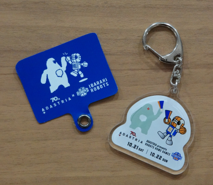 10月22日(日)の試合にご来場いただいた4500名へ、アダストリアの創業70周年を記念して誕生したキャラクター「Aモン」と、茨城ロボッツのマスコットキャラクター「ロボスケ」をデザインしたオリジナルキーホルダーとインサートシートを配布します。昨シーズンの3月18日(土)・19日(日)に開催された広島ドラゴンフライズ戦で配布し、お客さまからご好評をいただいた「オリジナルスマホショルダーproduce by ADASTRIA」と組み合わせて使用することができます。