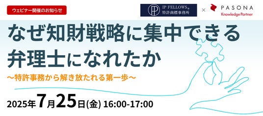 株式会社パソナナレッジパートナーは、弁理士の皆さまや、小・中規模の特許事務所の皆さまを対象に、オンラインセミナー「なぜ知財戦略に集中できる弁理士になれたか~特許事務から解き放たれる第一歩~」を、7月25日(金)に開催いたします。