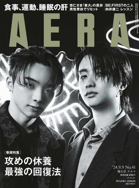 9月2日発売のAERA9月9日増大号は、BE:FIRSTからRYUHEIさんとJUNONさんが表紙に登場。インタビューでは、グループの今とこれからについてたっぷり語っています。ネオンとベッドとスモークのアーティスティックな背景のなかで行われた撮影では、思う存分、表現力を発揮しています。巻頭特集は「攻めの休養 最強の回復法」。酷暑や日々の忙しさでたまった疲れをどう取り除けばいいのか、食事や運動、睡眠などについて専門家がアドバイスします。「女性×働く」連載のテーマは「男性」。育休をとった朝日新聞の男性記者に起きた変化について、本人が詳細レポートします。大好評連載「向井康二が学ぶ 白熱カメラレッスン」は、街なかでプロのモデルを被写体に撮影。「iPhone撮影とは真逆」のアプローチにトライします。大好評連載「松下洸平 じゅうにんといろ」は、照明デザイナーの東海林弘靖さんとの明かりをめぐる深いトークの最終回です。ほかにもさまざまな企画が詰まった一冊です。