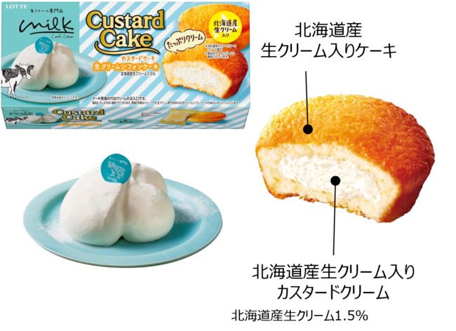 ふわふわ食感の北海道産生クリーム入りのケーキに、北海道産生クリーム入りカスタードクリームを閉じ込めました。
