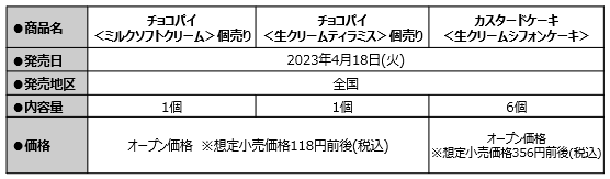 チョコパイ<ミルクソフトクリーム>個売り・チョコパイ<生クリームティラミス>個売り、カスタードケーキ<生クリームシフォンケーキ> 2023年4月18日(火)より全国で発売