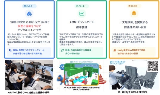 教室に通うことが難しい不登校の児童生徒に対し、自宅からアバターを使って参加できる「メタバース空間の学校」や、AIを活用した個別最適化学習プラットフォームが出展。生徒に多様な学びの選択肢を提供しつつ、教員の個別対応の負担も軽減します。