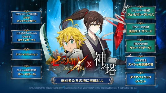 ネットマーブルは、スマートフォン向けシネマティックアドベンチャーRPG『七つの大罪 ~光と闇の交戦(ひかりとやみのグランドクロス)~』(略称:グラクロ)において、1月31日(水)より、韓国の人気ウェブトゥーン『神之塔』とのコラボイベントを開催することをお知らせいたします。