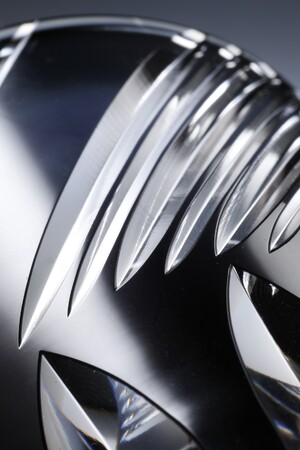 特筆すべきは従来の江戸切子に見られるような鮮やかな色使いではなく、「黒切子」と呼ばれる漆黒の色ガラスであること。黒切子は光が透けないので、全体のバランスを見ながら削り加工していくのがとても難しいですが、本品は優れた技術によって、銃の砲腔(ほうこう)内に刻まれるライフリング(らせん状の溝)のような模様が切子の外側に刻まれています。これがマットな黒と相まって、銃をイメージさせています。