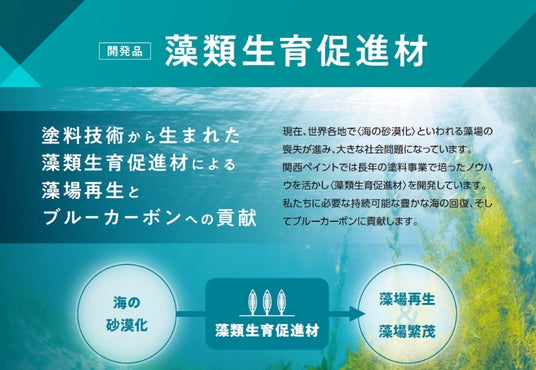 塗料技術から生まれた、藻場再生への取り組み【大阪市 北区】長年の塗料事業で培ったノウハウを生かし、藻場の再生・造成を支援する「藻類生育促進材」を開発中。藻場を再生することで、持続可能な豊かな海の回復、ブルーカーボンに貢献します。