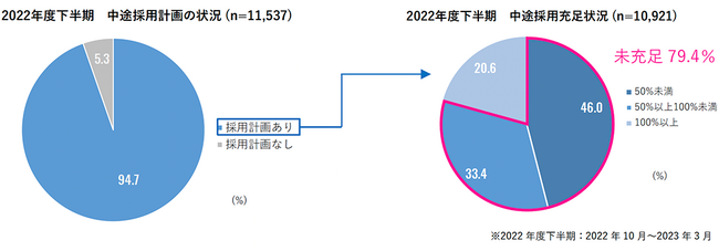 回答企業11,537社のうち2022年度下半期に中途採用計画があった企業は94.7%でした。採用計画ありの企業10,921社の中途採用充足状況を見ると、採用充足企業(計画に対して100%以上採用できた企業)は20.6%という結果でした。採用未充足企業(計画に対して採用が100%未満であった企業)は79.4%であり、中途採用充足率が50%に満たない企業は46.0%となりました。