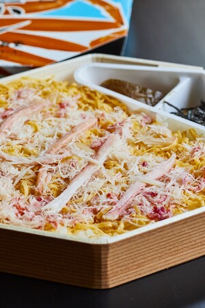 初の蟹の駅弁として有名な、鳥取県の名物「元祖かに寿し」。絶妙な塩梅の酢飯に蟹のほぐし身と脚、錦糸玉子がふんだんにちりばめられている。