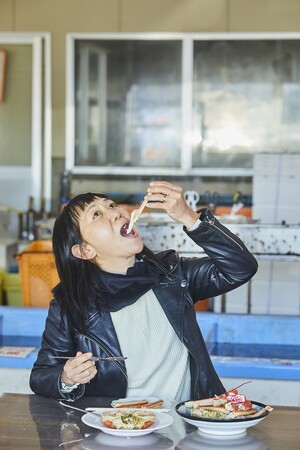 鳥取・賀露港で獲れたて、茹でたての松葉がにを味わう作家の角田光代さん。エッセイを特別に寄稿してもらった。