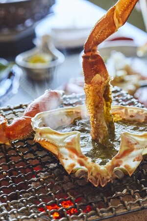 ふつふつと湧き上がる蟹みそに蟹の脚をたっぷり浸して食す『味覚のお宿 山田屋』(鳥取県賀露町)の「焼き蟹」。