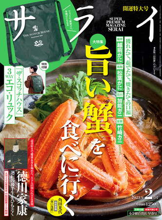 英国の老舗ブランド『ザ・スコッチハウス』のロゴを配したリュックです。同ブランドのカラーである深緑のボディに、日本上陸50年を記念する白いロゴが映えます。大特集は「旨い『蟹』を食べに行く」。豊漁のニュースで湧く、今が旬の蟹。全国の名産地を巡り、獲れたて・茹でたて・焼きたての美味を堪能します。