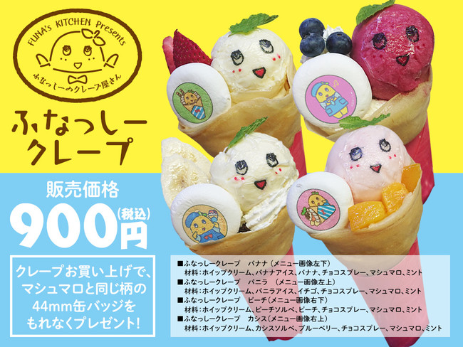 クレープお買い上げで、マシュマロと同じ柄の44mm缶バッジをプレゼント!