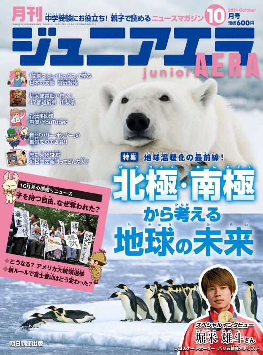 親子で楽しく読めて、中学受験・高校入試の勉強にも役立つ、小中学生のためのニュース月刊誌ジュニアエラ10月号が、2024年9月13日(金)に発売されました。今号の特集は「北極・南極から考える地球の未来」。地球温暖化の最前線の「極地」のいまがわかります。インタビューは、プロスケートボーダー・パリ五輪金メダリストの堀米雄斗さんです。人気連載「『文豪ストレイドッグス』で学ぶ 日本の文豪」は、宮沢賢治が登場します。