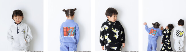 コラボアイテムはレディースアイテムで2型、キッズアイテムで4型の計6型をご用意。レディースアイテムは1枚で着映えするスウェットや軽くて温かいフリース素材のトップスを、キッズアイテムではレディースアイテムと同様のスウェットやフリース素材のトップスに加えて、セットアップとして使えるパンツや1枚あると便利なブルゾンを作成しました。オリジナルアートを使用したコラボアイテムは、ポップでカラフルな80’sムードをデザインに取り入れることで、古着屋さんで見つけてきたようなギーク感のある雰囲気に仕上がりました。着るだけで楽しい気持ちになれるラインアップです。