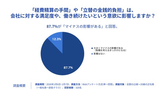 「経費精算の手間や立替の金銭的負担は会社に対する満足度や、働き続けたいという意欲に影響しますか」と尋ねたところ、87.7%が「影響がある」と答えました。この結果は経費精算の仕組みそのものが、離職リスクに直結していることを示唆しています。