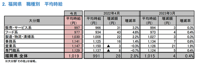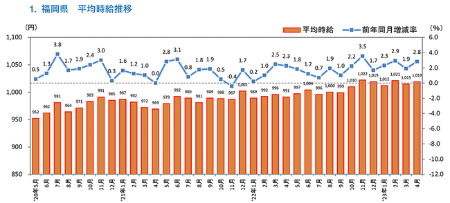 ■福岡県の平均時給は1,019円(前年同月991円、前月1,015円)
