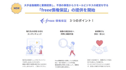 フリー株式会社(本社:東京都品川区、CEO:佐々木大輔、以下「freee」)は、株式会社三井住友銀行、みずほファクター株式会社、三菱UFJファクター株式会社と業務提携し、取引先の信用チェックがまとめて簡単にでき、不測の事態からスモールビジネスの経営を守る「freee債権保証」の提供を3月3日から開始します。