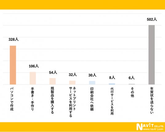 こちらのアンケートも複数回答にていただいております。年賀状の作成方法についてのアンケートでは、「パソコンで作成」という人が最も多く328人、2番目は「手書き・手作り」と回答された人が106人という結果になりました。