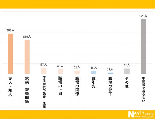こちらは複数回答のアンケートです。年賀状を送る相手についてのアンケートでは「知人・友人」と答えた人が388人で最も多く、次に多かったのが「家族・親類関係」で326人という結果になりました。