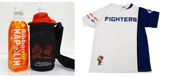ファイターズ新ユニフォームデザインオリジナルTシャツには、袖口に「交通ルールを守ろう」と注意喚起のメッセージが入っており、北海道コンサドーレ札幌・リボンちゃんデザインボトルカバーは、ドーレくんとリボンちゃんのイラストをあしらい、コンサドーレのロゴが暗闇でも光るように作成しました。