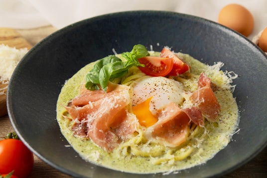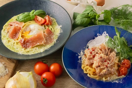 ▲半熟に仕上げた北坂たまごのバジルカルボナーラ風 淡路トマト添え