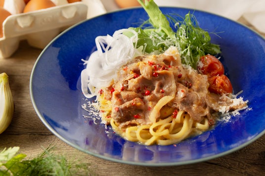 コクがありつつも爽やかなカルボナーラソースをまとった生パスタに、ともに淡路島産の『北坂たまご』とトマトを。味わい深さとさっぱり感が組み合わさった、夏にうれしい味わいです。