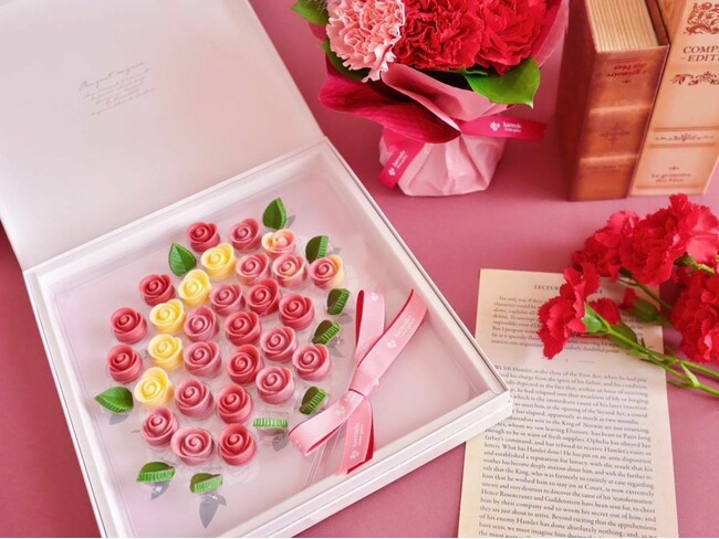 バラの花束に見立てたボックスチョコレート。赤やピンクの華やかさがギフトにオススメな商品となっております。