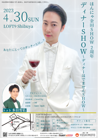 このたび、2023年4月30日にはんにゃ.金田哲のYouTubeチャンネル「はんにゃ金田SHOW」開設2周年を記念し、ディナーが出ないディナーショーの開催が決定致しました。本公演では、2周年を迎えた「はんにゃ金田SHOW」にちなんだスペシャルな企画を行います。金田とゆかりのある“あの人”も登壇しにきてくれるかもしれません…。