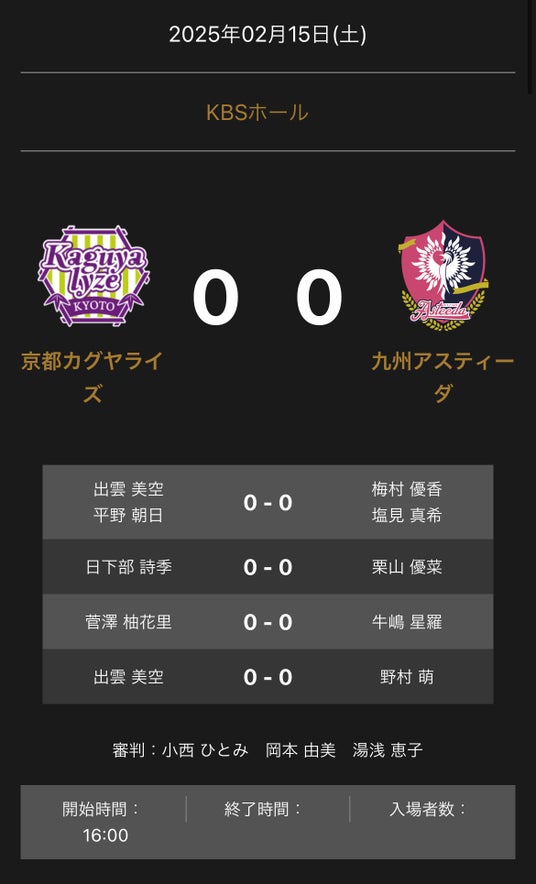 ノジマTリーグ 2024-2025 公式戦 2月16日開催 の「京都カグヤライズ vs 九州アスティーダ」のオーダーを発表いたします。
