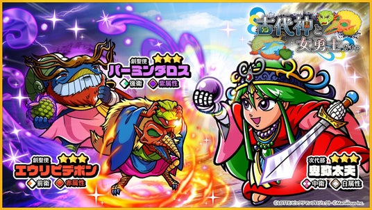 新たな☆3キャラクター「[創聖使] エウリピデボン」と、「[創聖使] パーミンダロス」と、「[次代部] 卑弥太夫」が登場する、「古代神と女勇士ガチャ」を開始いたしました。