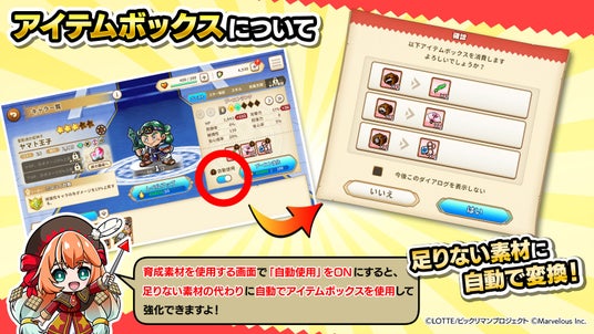 【キャラ一覧】画面では、足りない強化素材の代わりに「アイテムボックス」を使用できます。