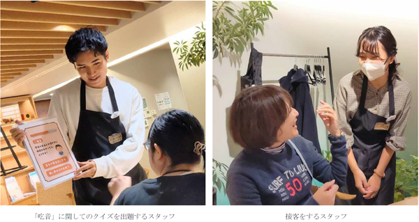イベントを開始すると、お客さまは学生スタッフからカフェのコンセプトや吃音についての説明を受け、その後はスタッフとのゆっくりとした会話を楽しまれていました。事前に用意した吃音にまつわるクイズを出題し、理解を深める場面もありました。クイズの最後には、「吃音の症状は人によってさまざまです。『あなたはどう接してほしい?』と聞いて、その人に合った支援をしてあげてほしいです。」と締めくくり、吃音当事者に対する個別性のある支援を呼びかけていました。