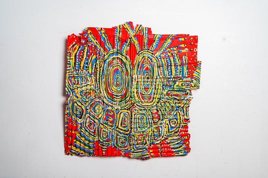 「覚悟を持って挑む事 それが勇気だ 何も考えないで衝動的に挑む事は単なる向こう見ずである」アクリル画/トタンアート 縦91×横72.7cm+トタン 価格:1,580,000円