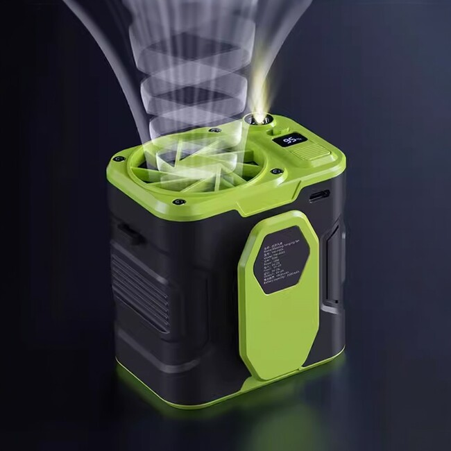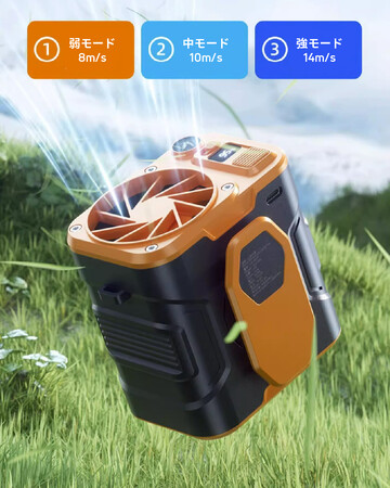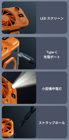 3段階の風速調整/最大14m/sの冷風/10000mAhの大容量電池/最大25時間連続動作/重さわずか308g/コンパクト/懐中電灯/Type-C充電