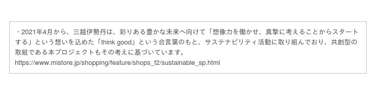 ・グッドマインドプロジェクトでは「今、ビジネスとデザインに求められるものは何か?」の答えの一つとして、百貨店がもつリソース(グループネットワーク、販売ノウハウ、販路等)とデザインの持つ力を掛け合わせ、売る場を持たないD2C企業に対して、共創型ソリューションを提供し、持続可能なビジネス展開をめざしていきます。